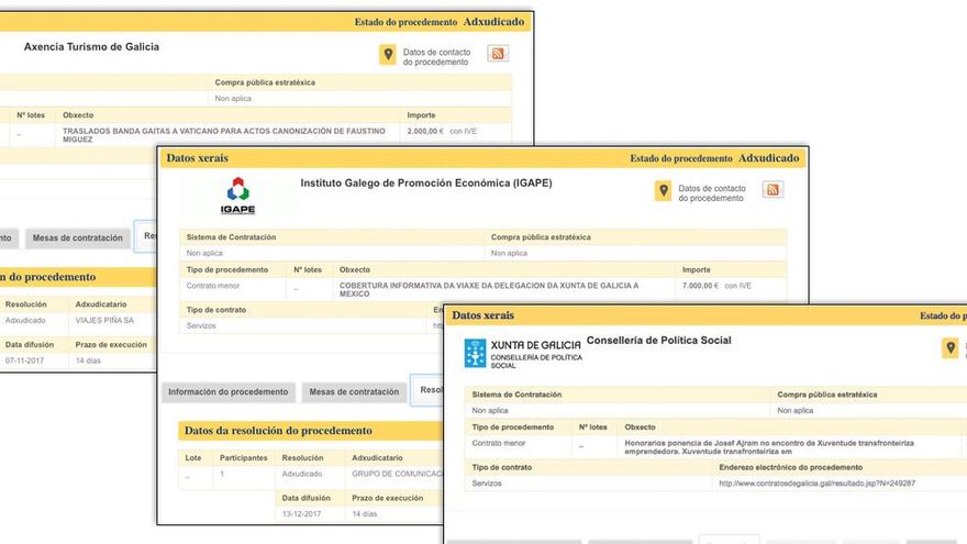 Entre estos contratos menores abundan los suministros habituales a todo tipo de centros administrativos -material sanitario o consumibles para fotocopiadoras, por ejemplo-, reposiciones de mobiliario de toda clase de importes o pagos por reparaciones, aunque también otros contratos más llamativos. Algunos ejemplos de los segundos en estos últimos meses pueden ser los 2.000 euros destinados por la Agencia Turismo de Galicia a sufragar el viaje de una banda de gaitas a la canonización en el Vaticano de Faustino Míguez, un sacerdote originario de Ourense, los 7.000 euros que pagó el Instituto Galego de Promoción Económica a la publicación Galicia en el mundo para la “cobertura informativa” de la visita de una “delegación de la Xunta a México” o los 5.900 euros que pagó la Consellería de Política Social por una conferencia de Josef Ajram, mediático broker de bolsa.