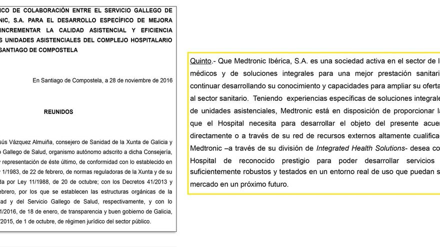 Entre noviembre de 2016 y mayo de 2017 el Servizo Galego de Saúde (Sergas) firmó hasta cinco convenios con la filial española de la multinacional estadounidense Medtronic, especializada en “tecnología, servicios y soluciones médicas”. Uno de estos acuerdos tenía como ámbito de aplicación el conjunto de la red hospitalaria del Sergas y los otros cuatro se ceñían a hospitales específicos; los de Vigo, Santiago, A Coruña y Lugo, en los cuatro casos con el mismo objetivo genérico de “incrementar la calidad asistencial y eficiencia operativa de las unidades asistenciales”. Las cláusulas generales de estos acuerdos son públicas en virtud de la ley de transparencia pero su contenido concreto se desarrolla en anexos que el Gobierno gallego no ha publicado y que ahora oculta específicamente al ser reclamados por pacientes de uno de los centros afectados, el compostelano.