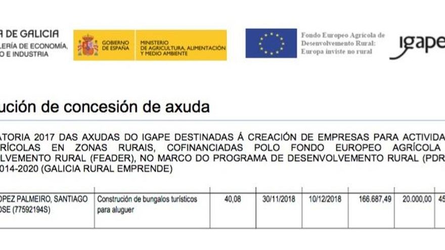 A pesar de esa situación, la Consellería de Economía otorgó a un autónomo una subvención de 65.000 euros, de un importe total subvencionable de 166.687,49 euros, para la construcción en Barreiros de cinco “bungalós turísticos para alquiler”. Y lo hizo con cargo a una convocatoria de ayudas del Instituto Galego de Promoción Económica (Igape) destinadas a la “creación de empresas para actividades no agrícolas en zonas rurales”, cofinanciadas por el Fondo Europeo Agrícola de Desarrollo Rural ( Feader).