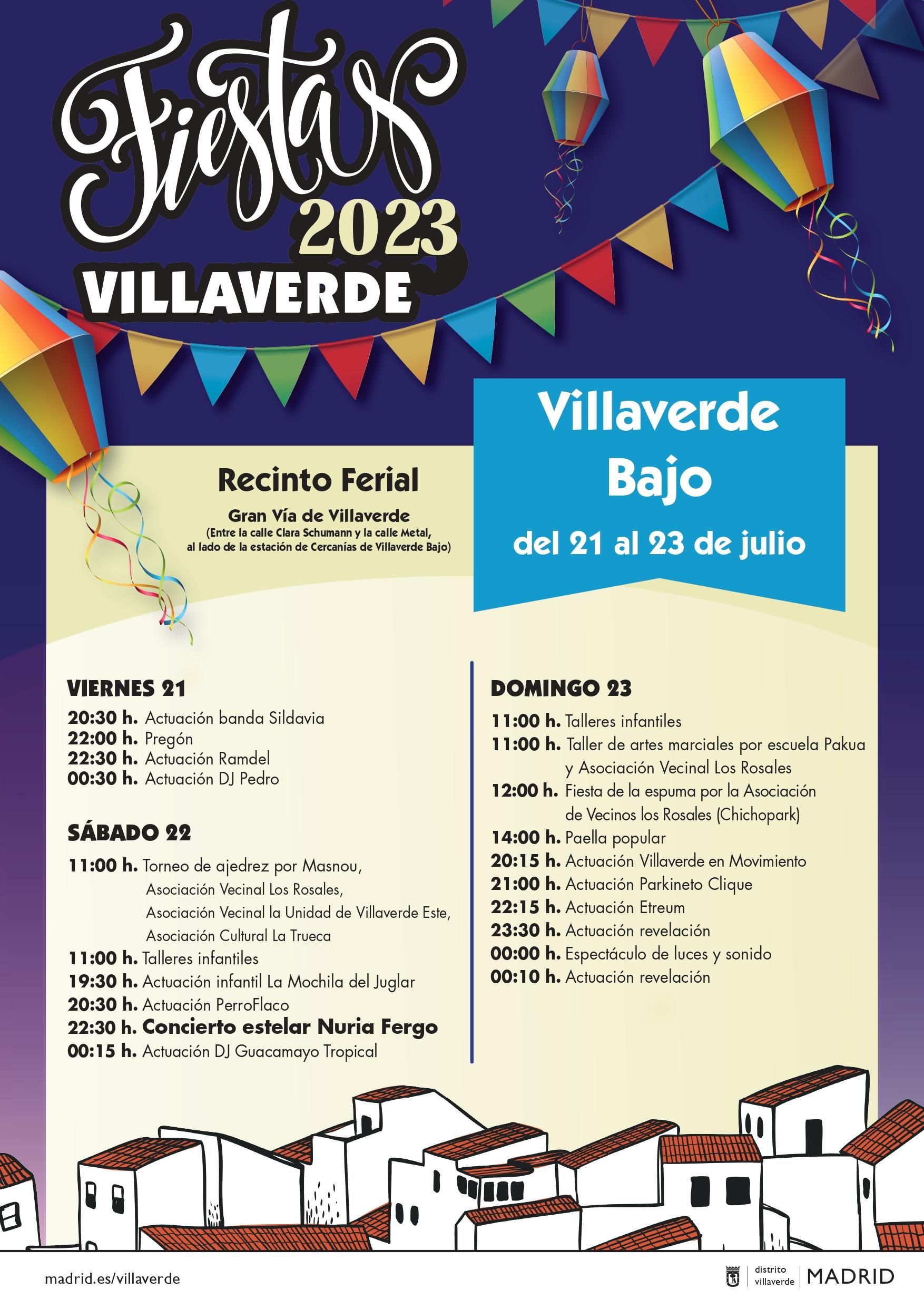 El sábado 22 habrá por la mañana un torneo de ajedrez y diferentes talleres pensados para los más pequeños. Además, la primera actuación de la tarde también estará dirigida al público infantil, que podrá asistir, a las 19:30 h, a La mochila del juglar, un espectáculo de canciones, cuentos y títeres con el que disfrutar toda la familia. A partir de las 20:30 h se subirá al escenario del recinto ferial Perro Flaco, un cantante tinerfeño afincado en Madrid. Luego llegará el concierto de Nuria Fergó, uno de los más esperados. La malagueña hará sonar en Villaverde Bajo los temas de su último trabajo, Con Permiso, además de otros éxitos. La noche del sábado terminará con la actuación de Guacamayo Tropical, el dúo colombiano que traerá cumbia, alegres ritmos latinoamericanos y muchas ganas de bailar.
