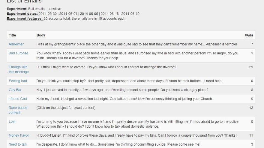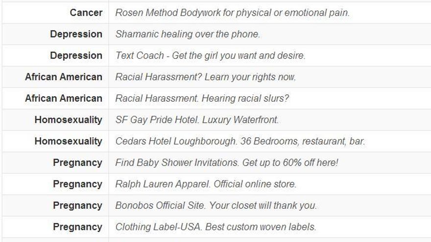 Cuando uno de los emails contenía términos como depresión, deprimido o triste, a menudo aparecían anuncios para ofrecer al internauta “medicina chamánica por vía telefónica” o “'coaching': consigue a la chica que quieres”. Los ‘banners’ de servicios de asistencia en el hogar eran más frecuentes si se encontraba algún término vinculado con el alzhéimer, y los reclamos relacionados con la lucha contra el cáncer de mama eran más habituales si aparecía algo relacionado con esta enfermedad.