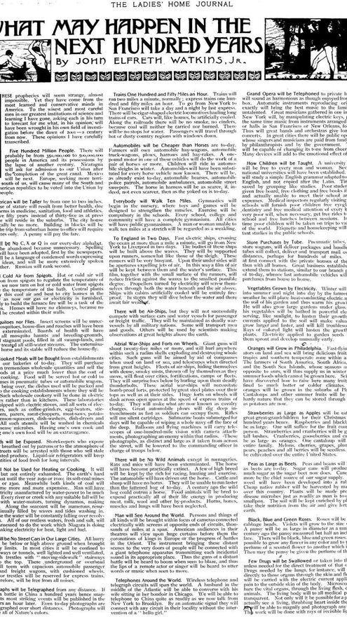 Para encontrar la siguiente profecía no hemos tenido que alejarnos mucho en el tiempo. En el año 1900, un articulo publicado en la revista 'Ladies Home Journal' bajo el título '¿Qué podía pasar en los próximos cien años?' profundizaba un poco más en la idea. Su premonitoria visión del futuro incluía una especie de red de cámaras y pantallas capaz de captar y transmitir imágenes y sonidos a “miles de millas” de distancia para después proyectarlos gracias a un instrumento similar a un teléfono gigante. Algo enrevesado, pero en el fondo similar a la red de ordenadores conectados de la que disfrutamos hoy en día gracias a internet.