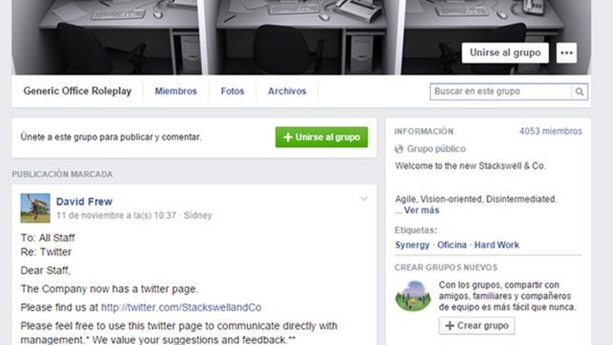 Si quieres unirte a Stackswell & Co. tienes que presentar tu candidatura en el grupo de la red social de Zuckerberg Generic Office Roleplay,Generic Office Roleplay el juego de rol de una oficina común. Entrarás a formar parte de una compañía que nació en Australia pero que, desde su fundación el pasado mes de agosto por un adolescente, Thomas Oscar, en sus ratos de intenso aburrimiento, ha logrado una rápida expansión internacional. Tiene empleados en EE.UU., Canadá, Japón, India, Finlandia o Costa Rica. Una empresa ágil y abierta, enfocada hacia los trámites, la burocracia y la eficiencia, términos contrapuestos pero que conviven en cualquier firma que se precie.