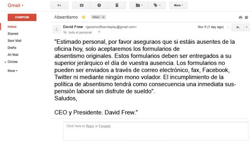 Sí, el formato podría ser el del correo electrónico de cualquier empresa. Incluso el contenido del correo podría estar en la mente de muchos empresarios, pero ningún consejero delegado de una multinacional de más de 4.000 empleados se atrevería a dejar registradas por escrito estas palabras. La educación y las buenas formas se imponen en el mundo de los negocios, al menos en apariencia. Excepto si la empresa es virtual, su código postal es Facebook y el propósito de sus empleados es huir de sus anodinas y rutinarias vidas utilizando el humor ácido y la jerga empresarial como vía de escape del trabajo.