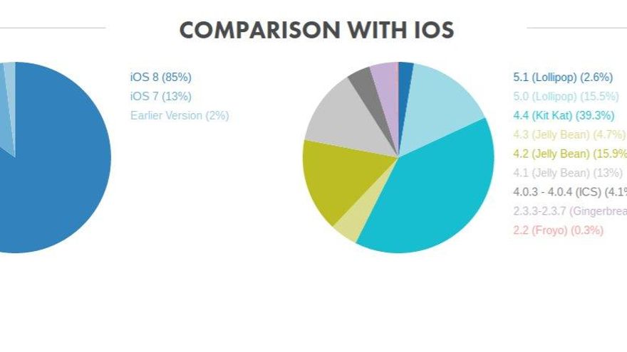 Es decir, un 57% de los dispositivos utilizan versiones superiores a KitKat, por lo que el resto se enfrenta a los problemas de seguridad que se han mencionado anteriormente. Estos datos contrastan con los de Apple: un 85% de iPhones y iPads ya tienen instalada la última versión, iOS 8. Al fin y al cabo, Apple controla la instalación de iOS en sus dispositivos, mientras que en el universo Android cada fabricante impone sus normas a la hora de distribuir las actualizaciones.