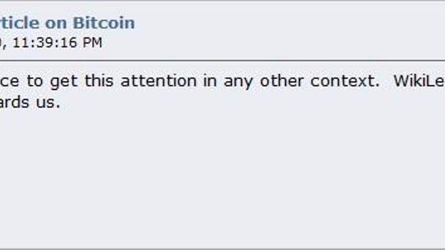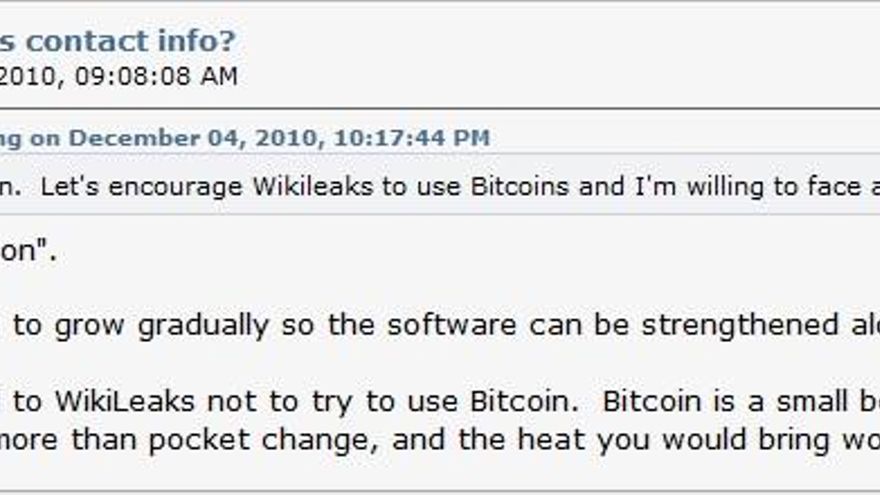 Tal y como relata Assange, tras el bloqueo de las plataformas de pago, en el foro oficial de Bitcoin se abrió un debate sobre la conveniencia de que las donaciones a WikiLeaks pudieran realizarse en bitcoines. La mayoría de los participantes veían con buenos ojos la unión. “Hay que ir a por todas”, sentenció un usuario. “Animemos a WikiLeaks a utilizar Bitcoin; estoy dispuesto a correr cualquier riesgo”.