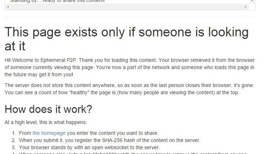 Como su propio nombre indica, el funcionamiento de la plataforma se basa en el ‘peer-to-peer’, que no solo sirve para intercambiar películas y series a través de Torrent. El proyecto de este desarrollador formado en el Instituto Tecnológico de Massachusetts (el famoso MIT) permite crear una web, en forma de fugaz archivo P2P, que solo existe mientras haya alguien navegando por ella.