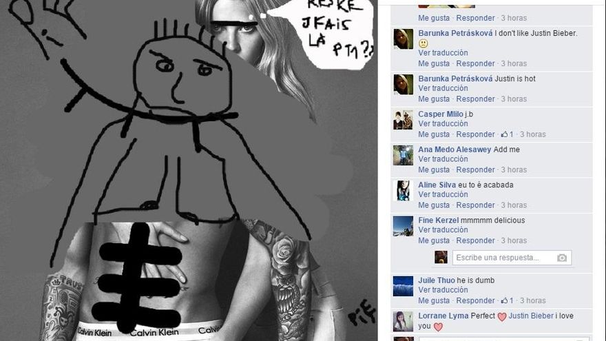 Poco a poco, estas pintadas digitales (con una calidad artística dudosa, eso sí) van apareciendo a lo largo y ancho de la red social, especialmente en los perfiles de personajes famosos. Si antes hemos visto cómo está el muro de Zuckerberg, a continuación puedes ver una versión algo más gamberra de la foto de perfil de Justin Bieber, cuyo muro parece haber sido uno de los principales objetivos de los grafiteros que ya pululan por Facebook.