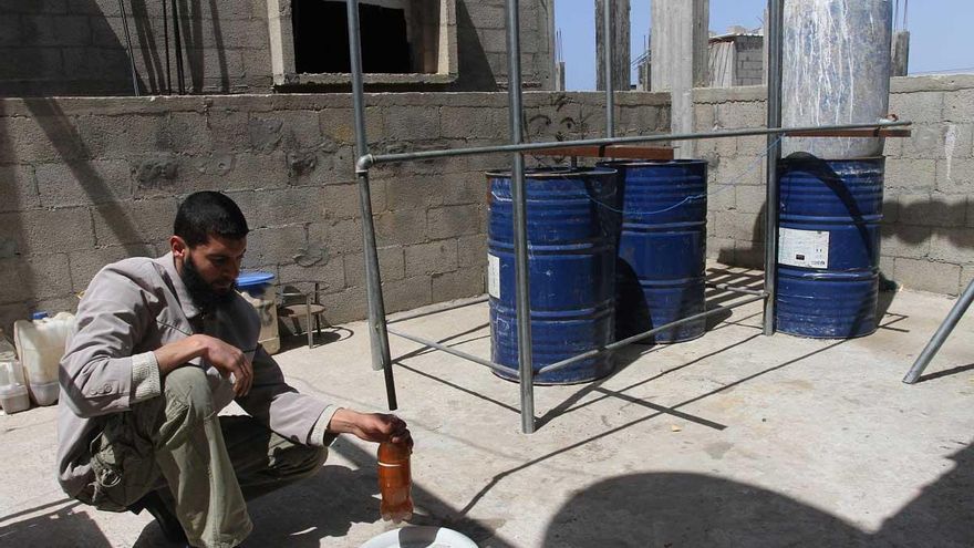 Lo hace de una forma muy sencilla, simulando una refinería a muy pequeña escala. Soboh ha construido una planta de metal donde introduce plástico cortado en pequeños trocitos, a una temperatura y presión determinadas, consiguiendo que el material se funda, aislándose del oxígeno y generando gases. Algunos de esos gases, dice, se condensan en los finos y largos tubos que forman el artilugio para luego producir una mezcla de gasolina líquida y diésel, aunque prefiere no explicar la técnica de forma minuciosa. “Es algo secreto, no puede contarse”, alega. Al final de esos tubitos, Soboh coloca recipientes que ayudan a recoger la mezcla, que después almacena en tanques.