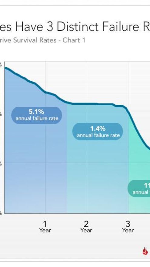 Según los datos de la empresa, después de 12 meses se había estropeado el 5,1% de los dispositivos, y la velocidad de “defunción” se mantenía durante seis meses más por culpa, sobre todo, de los defectos de fábrica. En los 18 meses posteriores, los discos sucumbían a una velocidad del 1,4% anual. Finalmente, estiman que un 80% de ellos sobreviven más allá de las cuatro primaveras.