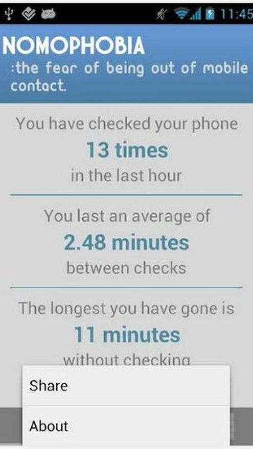 Dado que lo primero es tener constancia de nuestro problema, la aplicación 'Nomophobia for phone addiction' (en inglés) nos proporciona información sobre la última vez que utilizamos nuestro teléfono, cuáles son los periodos máximos de inactividad y cuál es la duración media de nuestras sesiones. La aplicación elabora además gráficos de nuestro comportamiento para que, de un solo vistazo, podamos ser conscientes de nuestra evolución. Los desarrolladores proponen, además, que estos datos sirvan para competir con las personas de nuestro entorno e ir ascendiendo en base a nuestros logros.