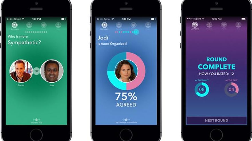 La aplicación muestra fotos de dos de sus compañeros, plantea una pregunta y el usuario debe responder tocando la imagen del culpable. Preguntas como cuál es el más organizado o con cuál es más probable salir de fiesta. Y olvídate de mentir. “Si te obligamos a tocar sólo a una persona, sólo tienes que tocar uno”, señala Cenedella. “En la aplicación es muy difícil mentir porque no es fácil volver atrás para rectificar”.