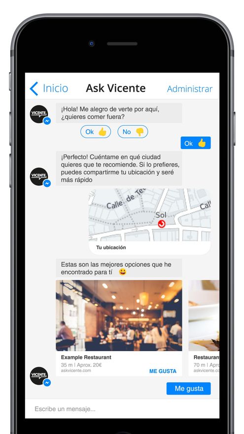 “En España el tema de los ‘chatbots’ es un tema muy incipiente y apenas hay empresas dedicadas a ello”, asegura María Romero, CEO de AskVicenteAskVicente, un asistente virtual gastronómico de la ‘startup’ Levebots que responde a través de Facebook Messenger, tanto en castellano como en inglés. Solo hay que saludarle con un cordial “Hola, Vicente” para comenzar a pedirle consejo sobre los mejores restaurantes. “Reconoce las peticiones de los usuarios mediante procesamiento de lenguaje natural”, indica Romero. La herramienta, entrenada a base de conversaciones sobre casos hipotéticos, incluye más de 100.000 establecimientos y funciona en España, Lisboa, Oporto y la zona del Algarve portugués.