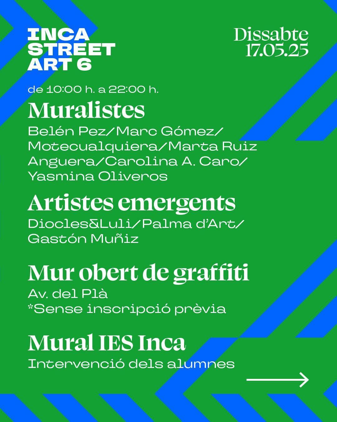 Aquest cap de setmana, Inca es convertirà en la capital de l'art urbà amb la celebració de la sisena edició d'Inca Street Art Fest. Aquest festival ja s'ha consolidat i ha convertit Inca en un vertader museu a l'aire lliure. La finalitat d'aquesta iniciativa és democratitzar la cultura, sensibilitzant a la població mitjançant obres que dialoguen amb el públic a peu de carrer, fent accessible a tots els ciutadans i visitants l'experiència de l'art.