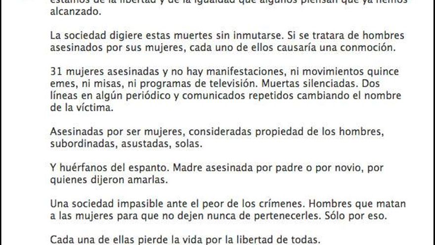 “31 mujeres asesinadas y no hay manifestaciones, ni movimientos quince emes, ni misas, ni programas de televisión. Muertas silenciadas. Dos líneas en algún periódico y comunicados repetidos cambiando el nombre de la víctima.”