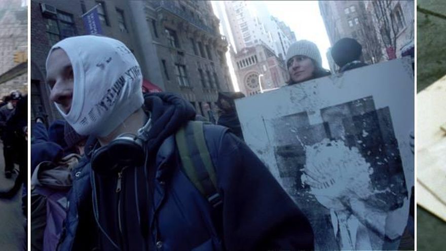 Unos días antes del comienzo de las movilizaciones contra el World Economic Forum en febrero de 2002, el alcalde de Nueva York desempolva una antigua ley (¡escrita en 1847!) que prohíbe el uso de máscaras durante cualquier acto público. La aplicación de la ley persigue un claro objetivo: permitir a la policía realizar a sus anchas un archivo fotográfico de los manifestantes.