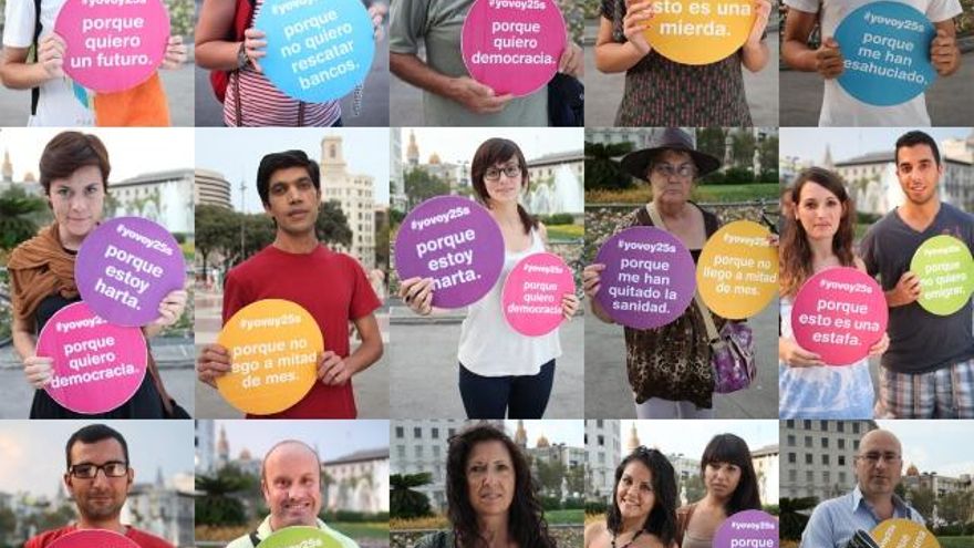 Campa: Esos puntos se convirtieron más tarde en fotografías. Montamos un Photocall que invitaba a la gente a fotografiarse con sus propias razones para acudir a un evento como el 25-S. Sacamos el Photocall a la calle y llamamos desde las redes sociales a que la gente se hiciera sus propias fotografías con sus razones. Se trataba de apostar así por la diversidad, abriendo una convocatoria en un principio muy excluyente.
