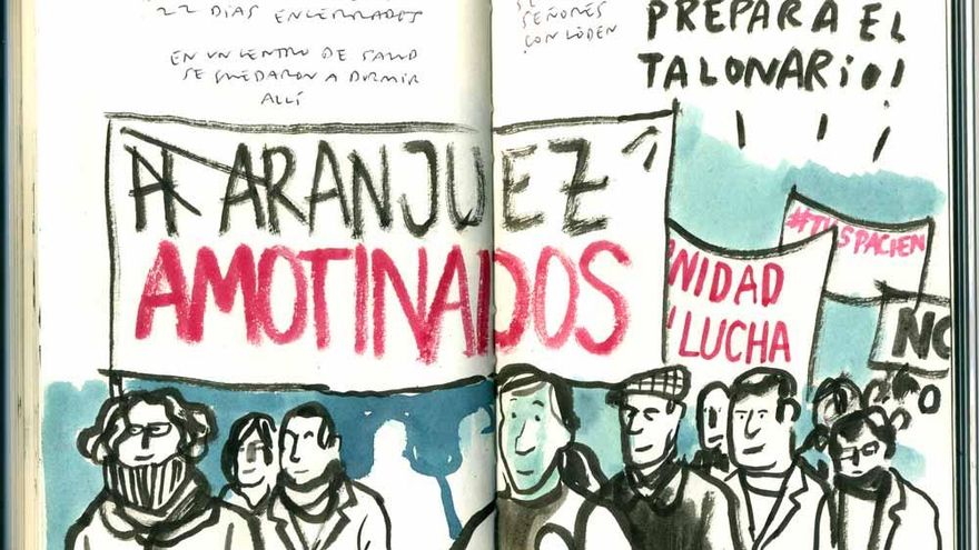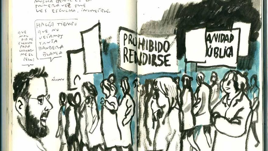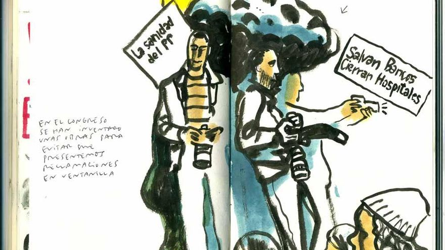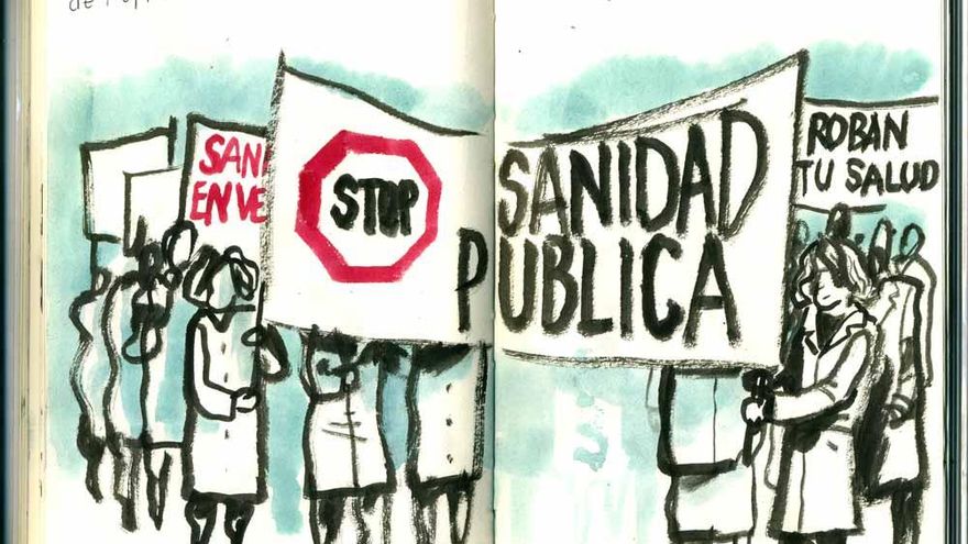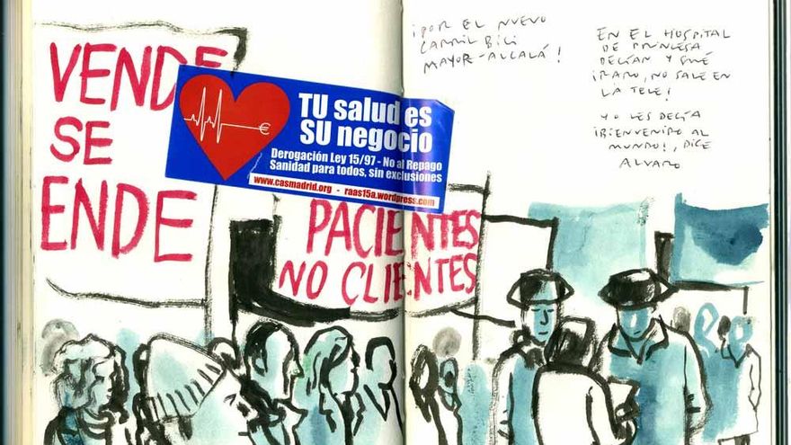 En el Hospital de la Princesa llevan varias semanas cortando la circulación de las calles aledañas interponiéndose entre los coches en la calzada y luego dan una vuelta al hospital haciendo lo propio, dos veces al día. Los gritos y cánticos hablan de la sanidad-pública, del no-nos-representan y de esto-es-un-atraco y hasta de estas-son-nuestras-armas mientras levantan las manos. No hay banderas e iconos de sindicatos, no son bienvenidos, menos aún de partidos políticos. Hay muchas pancartas y letreros individuales que representan únicamente a quien lo lleva. Las derivas callejeras son espontáneas y por supuesto incomunicadas, nadie las dirige, pero siempre ocurren. Todo se decide en asamblea, en una gran asamblea en el salón de actos del hospital. En esas manifestaciones que cortan la calle a veces bajo la lluvia y en esas asambleas está A., que nunca había hecho una huelga y que no habla jamás de política. Esta semana su servicio, siempre inundado de pacientes, estará parado por la huelga de todos.