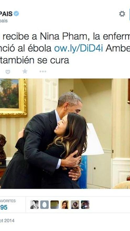 Y nuevamente, al igual que en el tema de fronteras, la situación en España con lo del ébola tal vez no sea tan distinta que la de la los Estados Unidos, donde también se han dado fallos en los protocolos y el ébola les ha pillado mal preparados. Eso sí, lo han reconocido y en vez de emplazar a todo su aparato mediático a destruir a la persona contagiada pues han investigado, mejorado, no se han cargado a su perrito, se han disculpado, etc... Es más, en esta foto que vemos, el Presidente nos demuestra que el ébola no se contagia de una persona ya sanada con un abrazo. En España sólo sabemos a día de hoy que el ébola no se contagia a través de una televisión de plasma. Y esto que parece una chanza es algo serio: las consultas en el hospital de Alcorcón siguen medio vacías, un subsahariano murió desangrado en Barajas porque nadie se atrevía a acercarse, el hermano de la técnico sanitaria fue despedida, en el colegio de los hijos de los compañeros de la técnico sanitaria los niños no iban a clase… Y todo eso por culpa de la falta de una clara información del Gobierno, del que, claro, ya no nos fiamos. Y fíjate, Obama o ha resuelto todo con una foto. Y nosotros en medio de una crisis sanitaria de tamaño descomunal con la Ministra desaparecida en Eurodisney o vete a saber donde y Mariano escondido llorando tras su plasma.