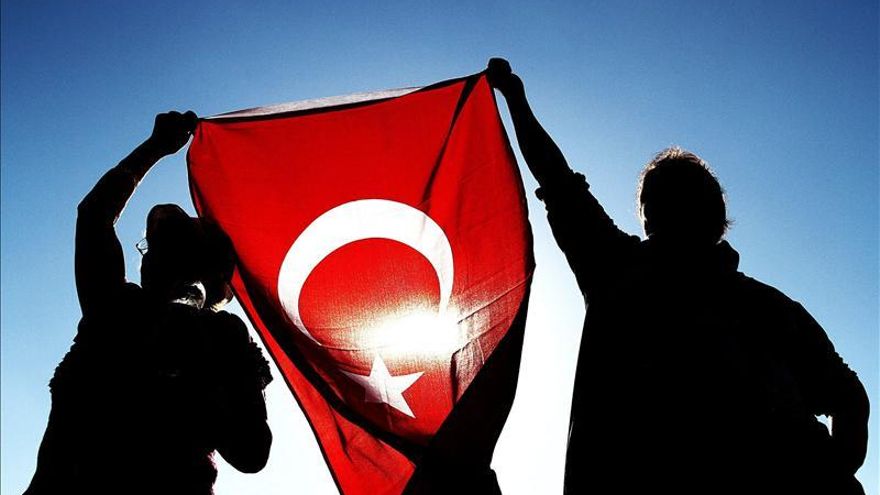 Unas siete personas quietas miran la bandera turca en Taksim.