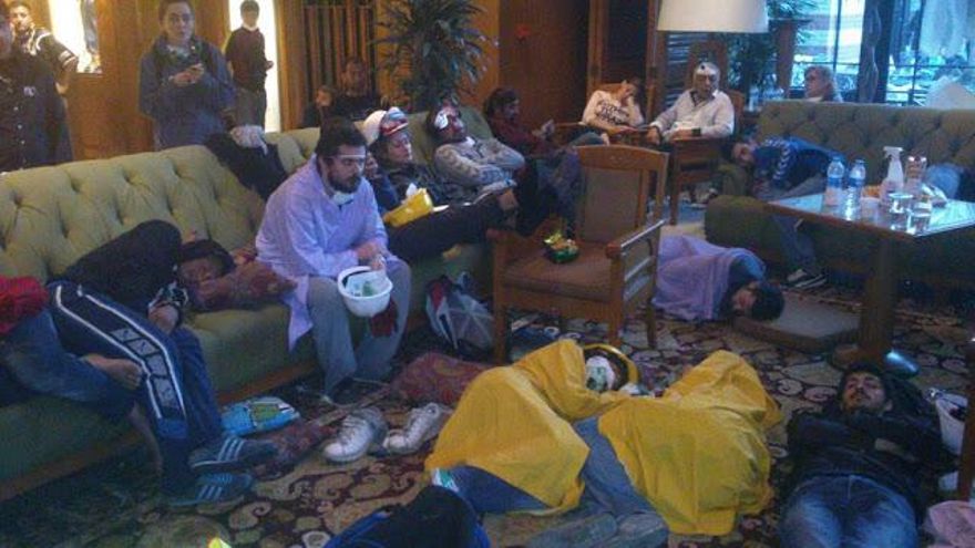 Detrás del parque, está el hotel Divan, donde siguen refugiados muchos acampados. Hay muchas miradas perdidas. Pasa una fila de policías por delante, uno de ellos empieza a empujar a un manifestante y grita: “Está muerto, el parque está muerto”. Lo dice en inglés, con mucha rabia. Los manifestantes le contestan cantando y ondeando una bandera turca.