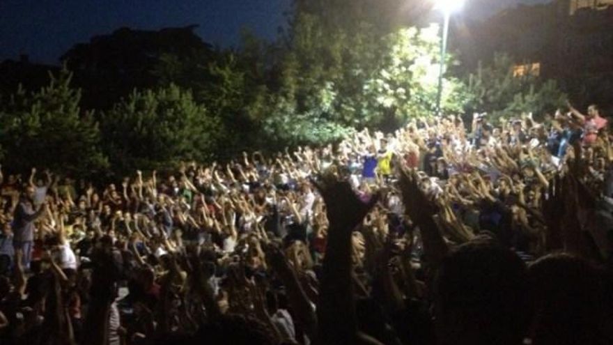 Al llegar a casa, un chico norteamericano me enseña en su móvil: ¡hay una asamblea en Besiktas! Corremos hacia allá. Hay unas doscientas personas moviendo las manos, alrededor de uno que habla con un megáfono. Le están aplaudiendo, con el lenguaje de los sordomudos, con el que se utilizaba también en Sol. Es la primera vez que lo veo aquí. Una chica turca se ofrece para traducirnos. Nos dice que estudia ciencias políticas en la universidad y que ha estudiado allí “la revolución pacifíca española”.