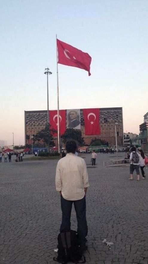Nuestra traductora interviene en la asamblea para hablar de un hombre que se ha plantado delante de la bandera turca del edificio Atatürk y lleva horas allí, quieto, sin hacer nada. Le buscamos en la plaza. Preguntamos a un chico: