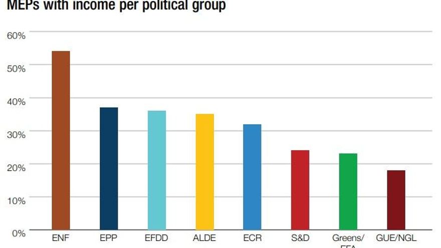 La formación ultraderechista y euroescéptica Movimiento de Europa de las Naciones y las Libertades es el bloque que tiene más eurodiputados con ingresos paralelos (54%). En segundo lugar se sitúa el Partido Popular Europeo, con el 37% y los euroescépticos de Europa de la Libertad y la Democracia Directa (36%).