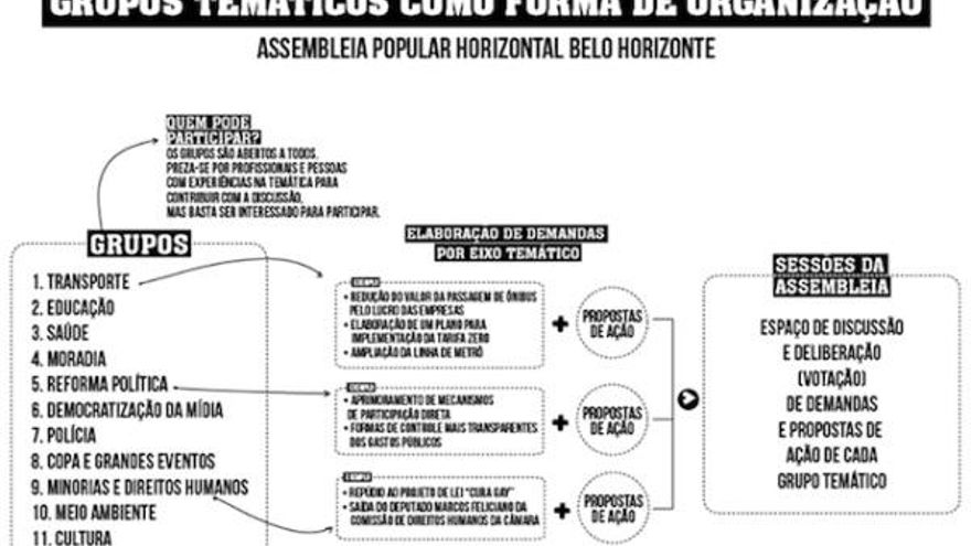 En Brasil, la remezcla de métodos y protocolos usados en otros lugares y momentos históricos se redondea con el uso del people´s voice de los movimientos cívicos estadounidenses, replicado por Occupy Wall Street en asambleas multitudinarias (una persona habla y el resto lo repite para que llegue el mensaje a las ultimas filas). Los gestos 15M realizados con las manos, se enriquecen con algunos otros. La formación de grupos de trabajo (conocidos como GT) ha sido otro común de las asambleas brasileñas con las del resto de revueltas. La Assembleia Popular Horizontal de Belo Horizonte, por ejemplo, cuenta con once grupos de trabajo, Transporte, Salud, Educación o Democratización de los Medios, entre otros.