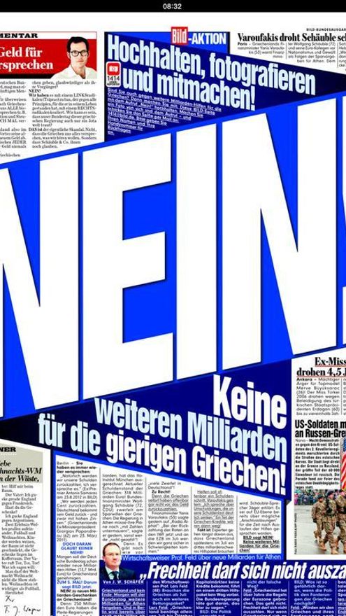 El pasado 27 de febrero, Bild, el diario sensacionalista alemán y el de mayor tirada del país, editaba una portada donde se leía un gran NEIN! Se trataba de que el Bundestag, los representantes políticos del país, votaran NO a los compromisos entre Grecia y UE que dan a los griegos una especie de tregua de cuatro meses. Sin embargo, ese mismo día la votación en el Parlamento alemán arrojó una mayoría aplastante en favor del aplazamiento con 542 votos a favor y 32 en contra.