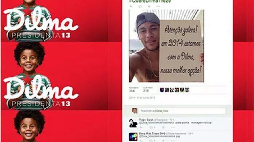 Sin embargo, desde el día 20 otra foto viral en las redes manda el recado contrario. Neymar sin camiseta sujeta un cartel: “Atención amigos, en 2014 estamos con Dilma, nuestra mejor opción”. La fotografía circula vinculada a un hashtag usado por los militantes del Partido de los Trabajadores (PT), #querodilmatreze. El vídeo oficial de Neymar no deja lugar a dudas. ¿Habrá gente que crea que el vídeo del Neymar real es falso? “Puede que sea un fake sobre otro fake. ¡Una locura! ¿Por qué los partidos están con esta saña para captar a celebridades para conseguir votos? Se agotaron en sus metanarrativas”, asegura Paulo Ganns en Facebook al comentar la foto trucada de Neymar.