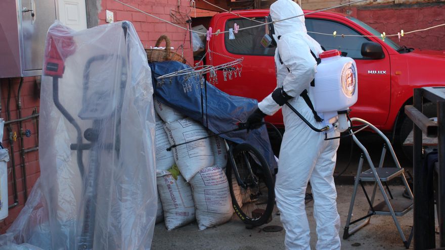 Ignacio pulveriza el amonio cuaternario por la fachada de la casa de Marcela Vicencio, una vecina que hoy servirá comida para 130 vecinos que no tienen como proveérsela. “Es muy bueno que vengan a sanitizar antes y después del almuerzo porque así se mantiene todo limpio. Es la forma como tratamos de ayudarnos entre todos”, dice la mujer mientras prepara la “olla común”. El joven pasa por encima de cada rincón y se detiene en puertas y pomos: “Me fijo sobre todo en las superficies más utilizadas, como marcos de entrada, manillas de muebles o el control del televisor, en las zonas de mayor ventilación y donde se retiene mucho el bicho, como cortinas o vértices de los techos”, detalla.