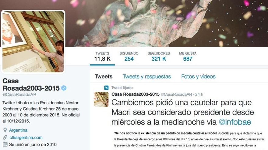 Mientras tanto, la cuenta de Twitter oficial del Gobierno también se hizo eco de la caducidad sobre la que se pronunció la justicia a pedido de Macri. Ahora es una cuenta-tributo a los 12 años de gobierno kirchneristas.