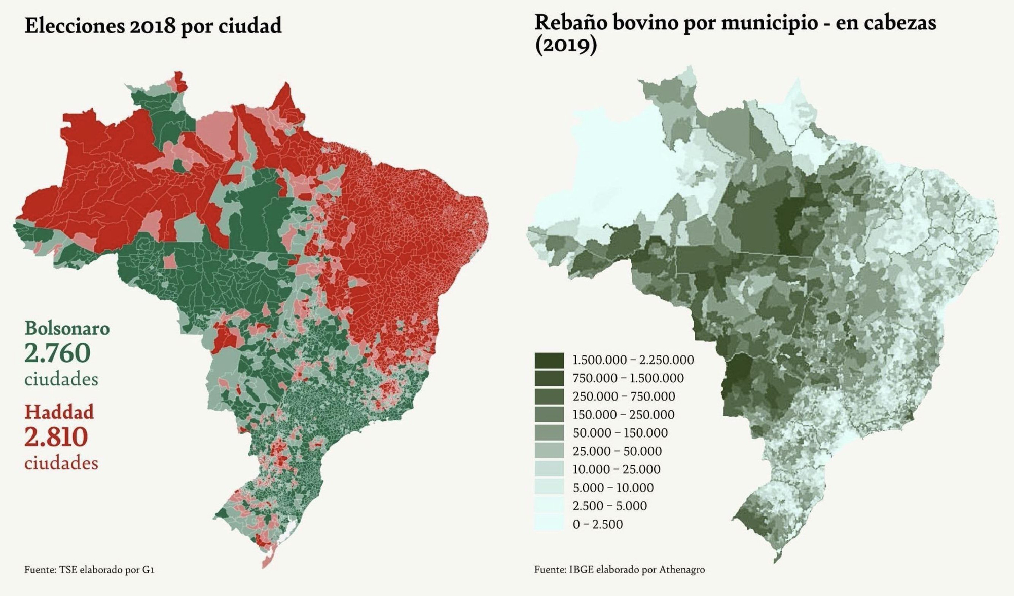 La región Norte, donde está la mayor parte de la Amazonia, cuadriplicó el número de animales desde 1985 y en ese mismo periodo la región Centro-Oeste duplicó la cifra de bovinos. Hoy concentra el 34% de nuestros 214,7 millones de animales. Sí: Brasil tiene un buey para cada habitante.