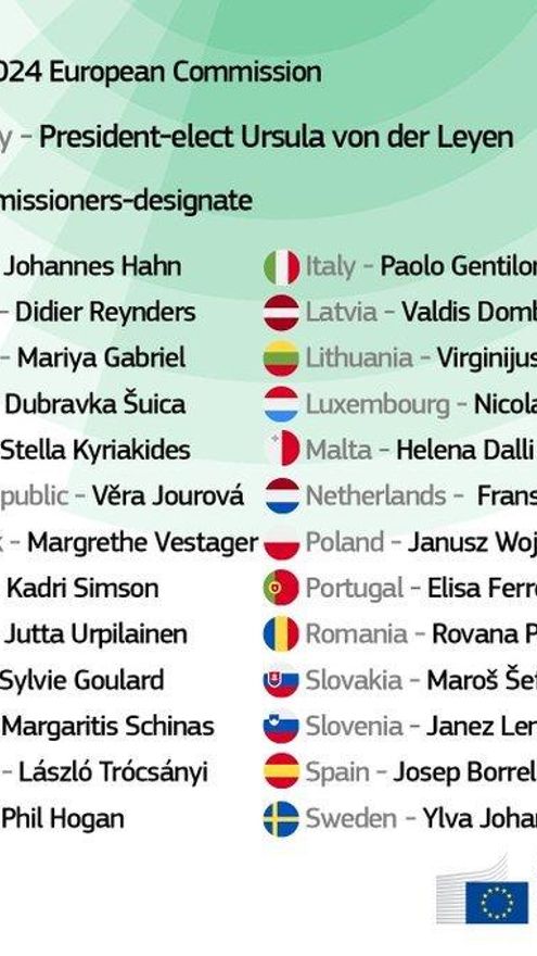 Von der Leyen prometió hacer vicepresidentes a los spitzenkandidaten socialdemócratas y liberales, el holandés Frans Timmermans, que repetiría en este puesto, y la danesa Margrethe Vestager. Además de estos dos nombres, herederá algún comisario más saliente del Ejecutivo de Juncker: el irlandés Phil Hogan, el letón Valdis Dombrovskis y la checa Vera Jourová.