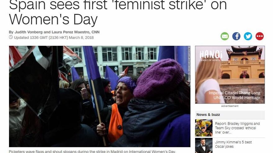 “Miles de mujeres sueltan sus herramientas, boicotean las labores domésticas y ocupan las calles de España en la primera huelga feminista del país”. Así arranca la noticia de la cadena estadounidense CNN sobre la huelga feminista del 8M en España. Como la CNN, los principales medios internacionales han hecho un seguimiento de las movilizaciones en España, que vive “uno de los mayores paros” a nivel internacional, añade la cadena americana.