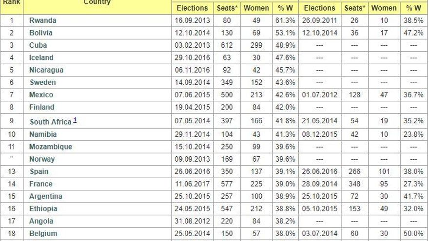 La clasificación mundial sitúa a Ruanda como el estado con mayor proporción de mujeres parlamentarias en el Congreso: el 61,3% de los diputados nacionales son políticas. Por detrás le siguen Bolivia (53,1%), Cuba (48,9%), Islandia (47,6%) y Nicaragua (45,7%).