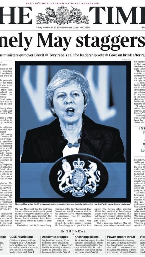 A lo largo de esta legislatura, May pareció más muerta que viva en varias ocasiones. En primer lugar, cuando convocó elecciones para blindarse con una mayoría más amplia en el Parlamento y sólo consiguió perderla. “Nada ha cambiado”, dijo después. Una viñeta de The Times puso a May dentro de un ataúd con esas mismas palabra saliendo de su interior. Otras la pintaban como un zombi que estaba muerto, pero que aún no lo sabía.