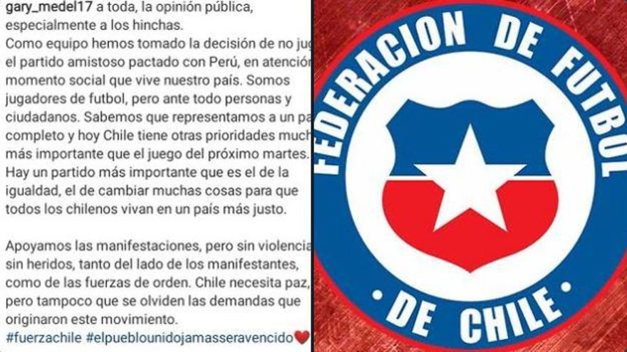 La selección chilena de fútbol no jugará finalmente el encuentro amistoso que debía disputar el próximo 19 de noviembre en Lima frente al conjunto nacional de Perú como muestra de solidaridad con las movilizaciones del pueblo de Chile.