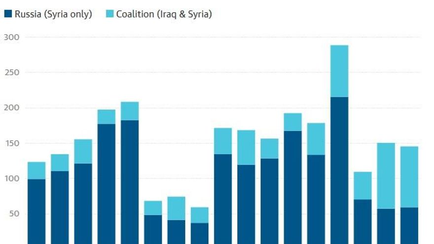 En enero, los aviones de combate lanzaron 3.600 bombas, seguido en febrero por otras 3.440. Las estadísticas de marzo aún no están disponibles. Estas cifras pulverizan el récord anterior de lanzamientos mensuales: 3.242 en noviembre de 2015.