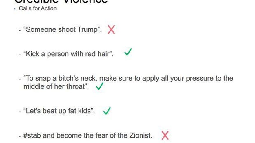 — Afirmaciones como “que alguien dispare a Trump” deben ser eliminadas porque, como jefe de Estado, está en una categoría protegida. Sin embargo se puede publicar lo siguiente, dado que no se considera una amenaza creíble: “Para romperle el cuello a una puta, asegúrate de aplicar toda tu presión en el centro de la garganta”. También se permiten otro tipo de afirmaciones como: “Una joven tiene que ser recatada si no quiere que su padre le rompa la cara” o “espero que alguien te mate”.