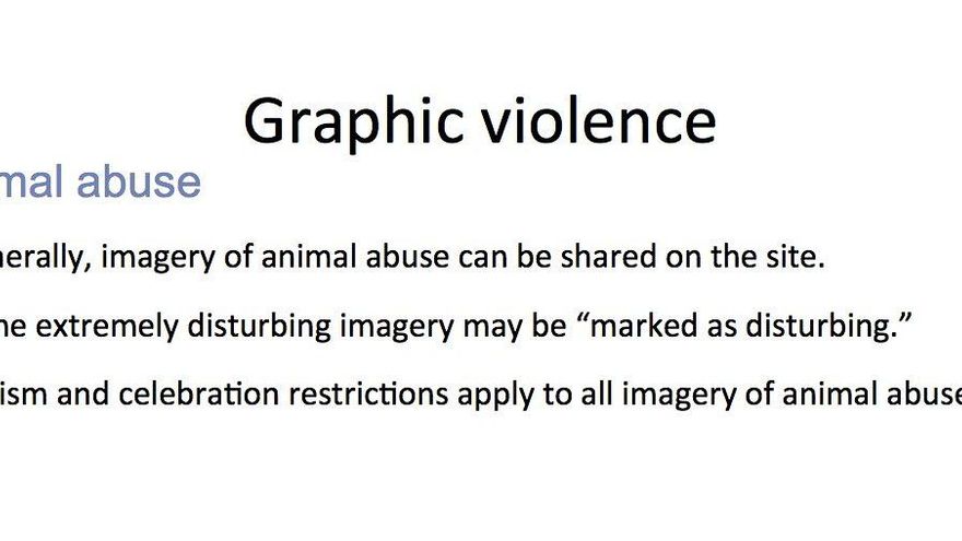 — Se pueden compartir fotografías de abusos a animales y solo se calificarán de “alarmantes” las imágenes extremadamente perturbadoras. Vídeos de torturas y mutilaciones se categorizarán como imágenes explícitas, pero no serán eliminados.