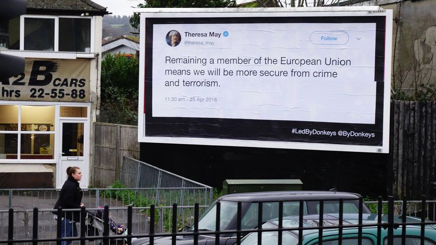 Dave no está solo. Tres hombres, con sudaderas, camisas de franela y gorras, observan su trabajo. El trabajo de todos, en realidad, ya que Richard, Adam y Chris son tres de los cuatro integrantes del grupo Led By Donkeys (Dirigidos por Burros): una campaña de guerrilla urbana a favor de la permanencia en la UE que denuncia la hipocresía y las mentiras de los políticos [que han defendido los beneficios de salir de la UE]. Lo hacen colgando carteles con algunas afirmaciones falsas de estos políticos en vallas publicitarias de todo el país.