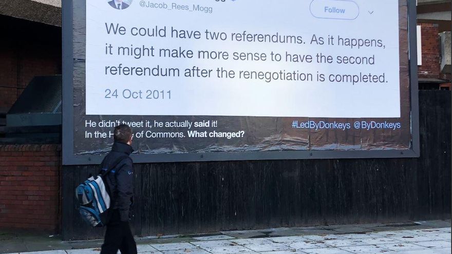Como la mayoría de buenas ideas, todo comenzó en un bar. Estaban comentando el ya célebre tuit de David Cameron -“El Reino Unido tiene un dilema simple e ineludible: estabilidad y un gobierno fuerte conmigo o caos con Ed Miliband”- que volvió a comentarse cuando Theresa May decidió posponer la votación en torno al acuerdo alcanzado con la UE. Fue entonces cuando uno de ellos preguntó: ¿Por qué no colgar este tuit en una valla publicitaria y que todos lo vean?