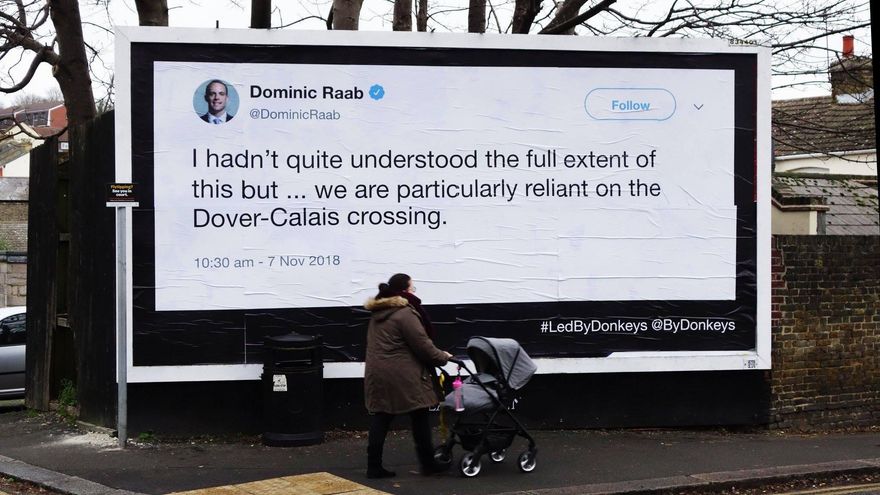 Esa noche Richard, Adam y Chris colgaron cuatro carteles en Dover. Además del de Fox, colgaron uno de Theresa May, “la emperatriz de los burros”, con la cita “si permanecemos en la Unión Europea estamos más expuestos a crímenes y terrorismo”, la cita de Ree-Mogg sobre un segundo referéndum y, evidentemente, la de Raab: “No terminé de comprender las implicaciones exactas pero…es importante destacar la dependencia que tenemos del estrecho de Calais [con un ferry que lo conecta con Dover]”.