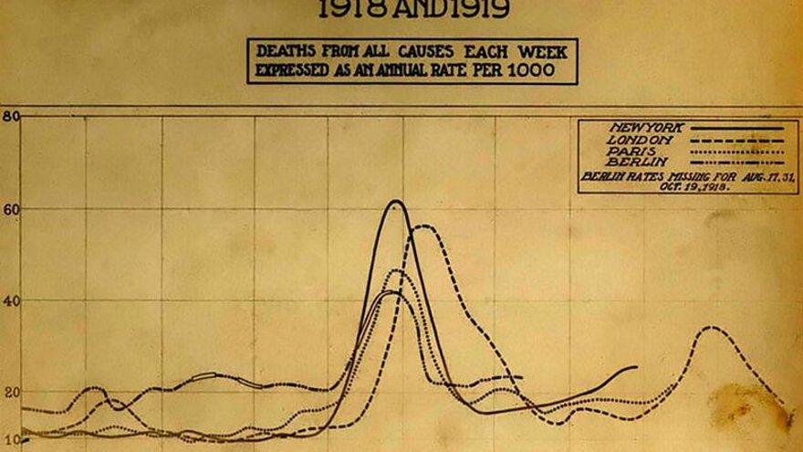 Sin embargo, tal vez nos conviene fijarnos en otro momento parecido de nuestra Historia. En los últimos días, se han publicado en las redes sociales unas sorprendentes imágenes de tablas y gráficos científicos de la pandemia de gripe de 1918. Aunque estos diagramas dibujados a mano puedan parecernos arcaicos, son una jarra de agua fría para los partidarios de una desescalada demasiado rápida y de levantar unas medidas que afectan a muchas personas de muchos países del mundo.