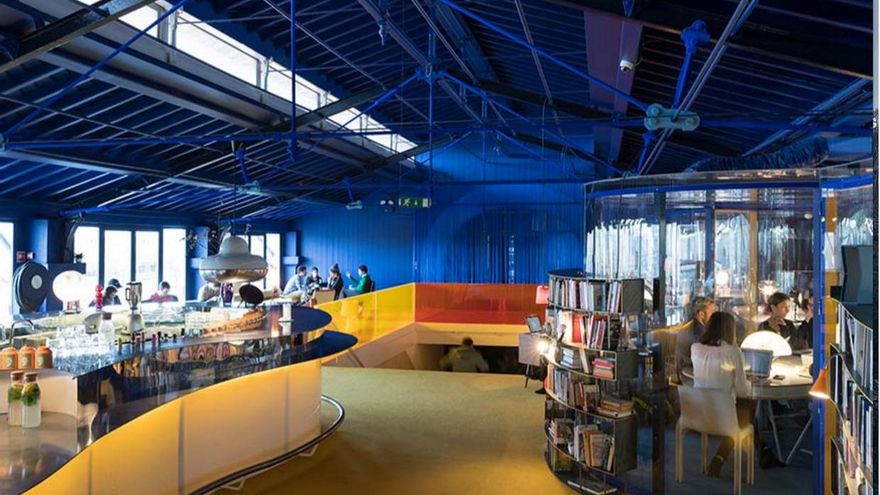 Los miembros pueden deleitarse con un programa de eventos culturales, sociales y sensoriales: una degustación de vinos, un salón literario, una introducción a la hidroponía. Una cafetería pintada de azul profundo ofrece bebidas tanto para los emprendedores como para el público en general.