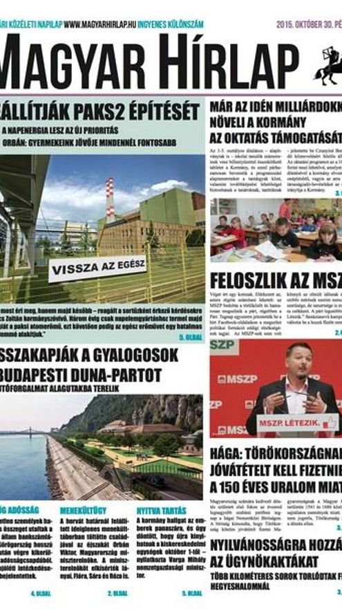 El diario informaba sobre la combinación ganadora de la lotería de la semana siguiente, daba un parte meteorológico hecho a partir de las sugerencias de los lectores e informaba de que las orillas del Danubio volverían a ser una zona peatonal y que los coches circularían por un carril subterráneo. Un reportaje sobre la crisis de los refugiados explicaba que Orbán había pasado una noche en un campamento situado en la frontera con Croacia, acompañado por su mujer y sus tres hijos. El primer ministro señalaba que había cambiado de opinión tres esa experiencia y se había visto obligado a reconocer que los refugiados “no son muy distintos a nosotros, excepto por el hecho de que han tenido que huir de un país sacudido por el integrismo religioso y el terrorismo”.