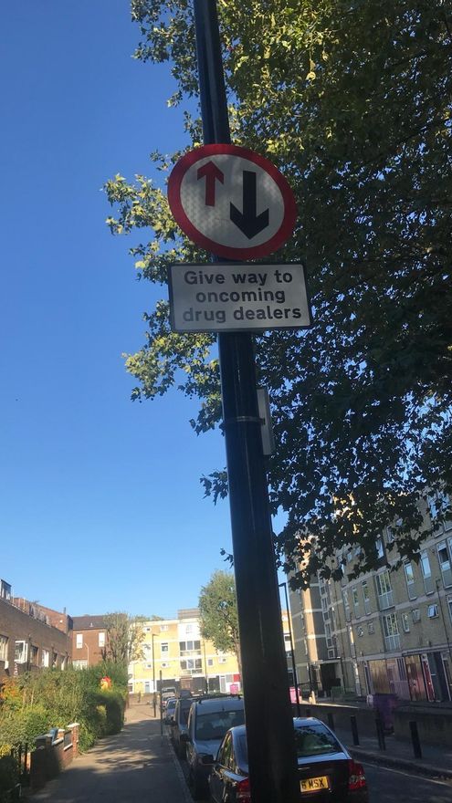 La libertad con la que los traficantes de drogas han estado trapicheando en una de las zonas más concurridas del este de Londres ha inspirado a la comunidad local para organizar una lucha satírica. Los vecinos han instalando señales por la ciudad que designan puntos de “recogida de crack” y que piden a los conductores “ceder el paso a los traficantes de drogas”.