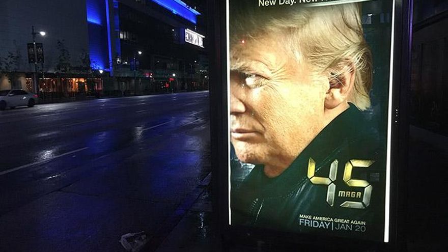 El artista provocó a los manifestantes el día de inauguración del presidente poniendo falsos anuncios cerca del ayuntamiento de Los Ángeles de la serie de Fox 24 con el texto, “Nuevo día, nuevo héroe”, pero sustituyendo a la estrella Corey Hawkins por Trump y el 24 por el 45, en referencia al 45º presidente de EEUU.